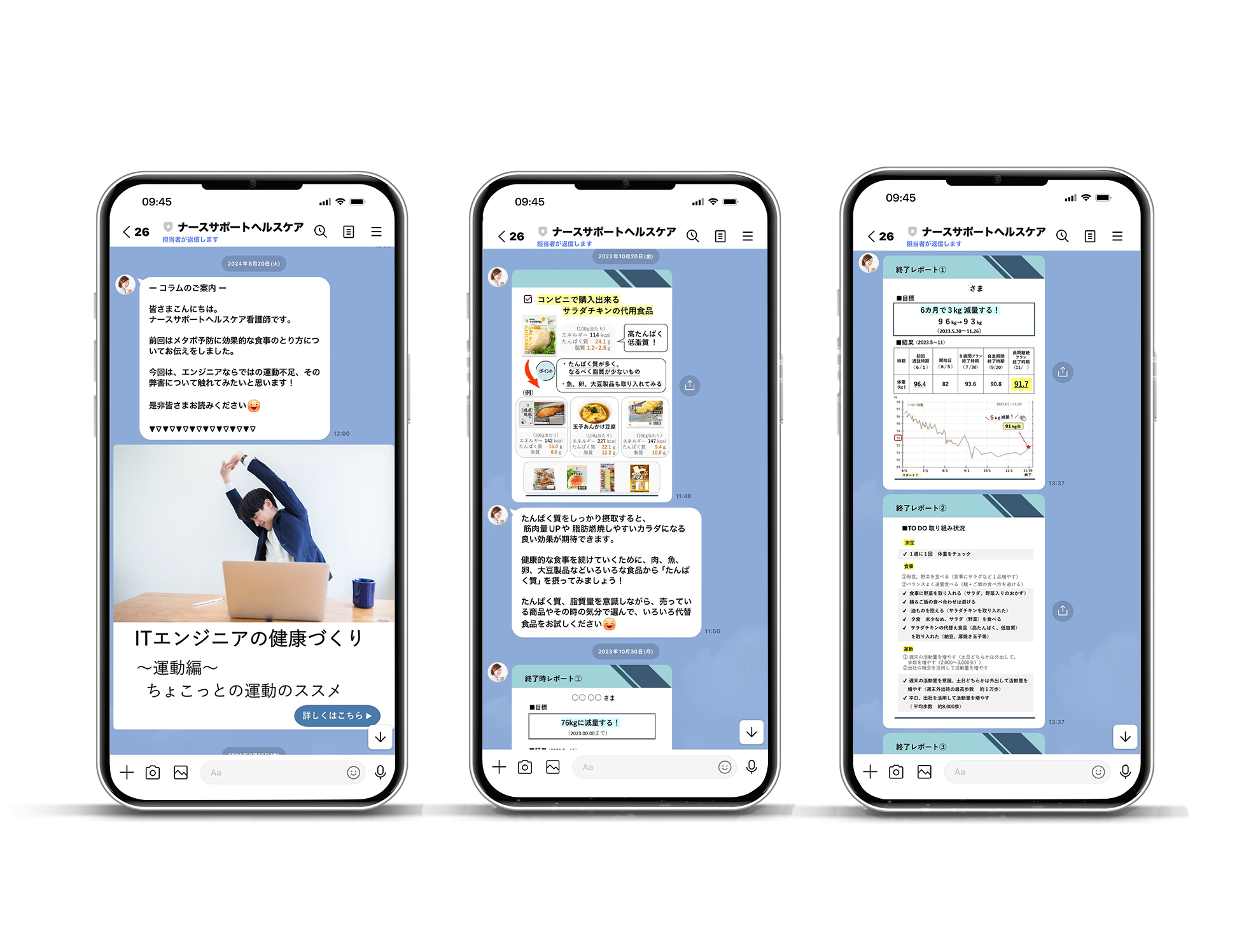 健康支援対象者は健康診断結果で指摘を受けた20~50代の男性(エンジニア職)。LINEでのサービス提供のため、メッセージや資料は読みやすく、わかりやすい内容とデザインを意識して作成しました。